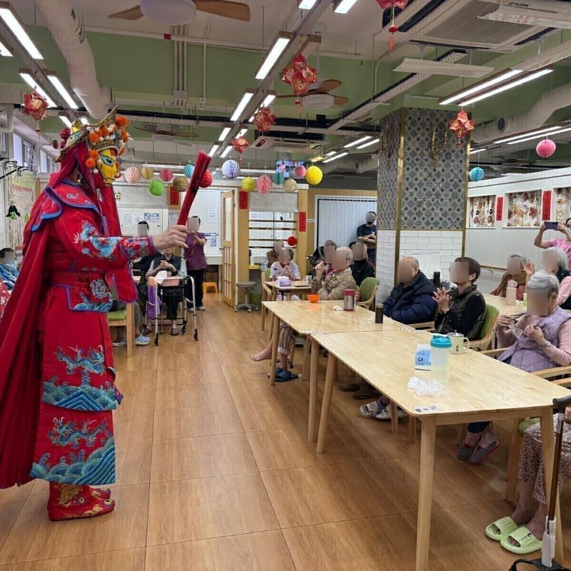 當日,校園集古村王牌變臉師傅Felix以精湛的變臉技藝驚艷全場。表演過程中,長者們圍坐觀賞,或拍照記錄,或鼓掌喝采,現場氣氛熱烈而溫馨。場地佈置亦充滿節慶感,彩球、燈籠高掛,讓護老院空間洋溢濃厚的文化氣息。