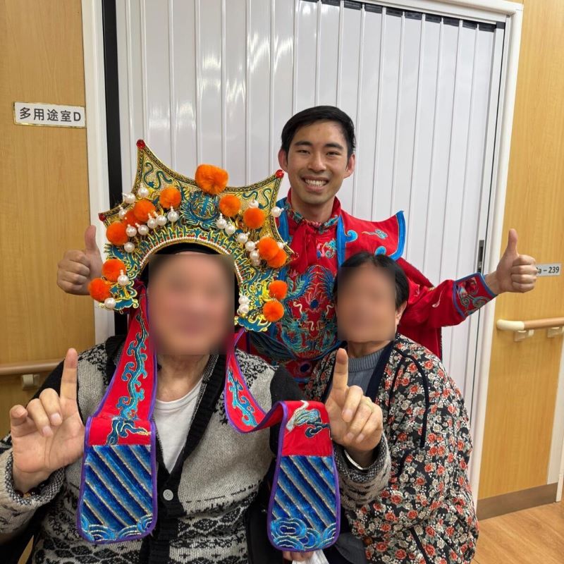 演出結束後,Felix與長者親切互動、合影留念。多位長者戴上川劇頭飾,手持紅色摺扇,比出勝利手勢,笑容燦爛,展現出活動帶來的喜悅與感動。部分長者雖行動不便,仍坐在輪椅上參與互動,工作人員細心陪伴,讓每位長者都感受到被重視與關愛。